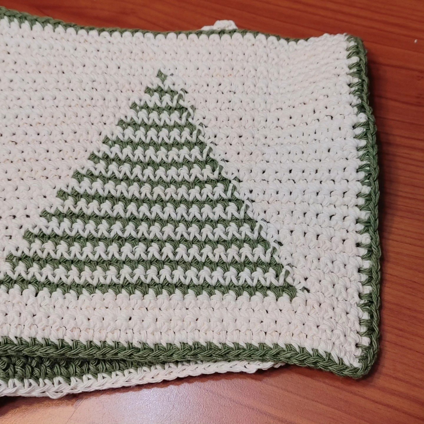 Add festive charm to your kitchen with this handmade crochet potholder featuring a classic Christmas tree design. Crafted in rich green with a contrasting white tree and border, this potholder is both decorative and functional—perfect for holiday cooking and baking.